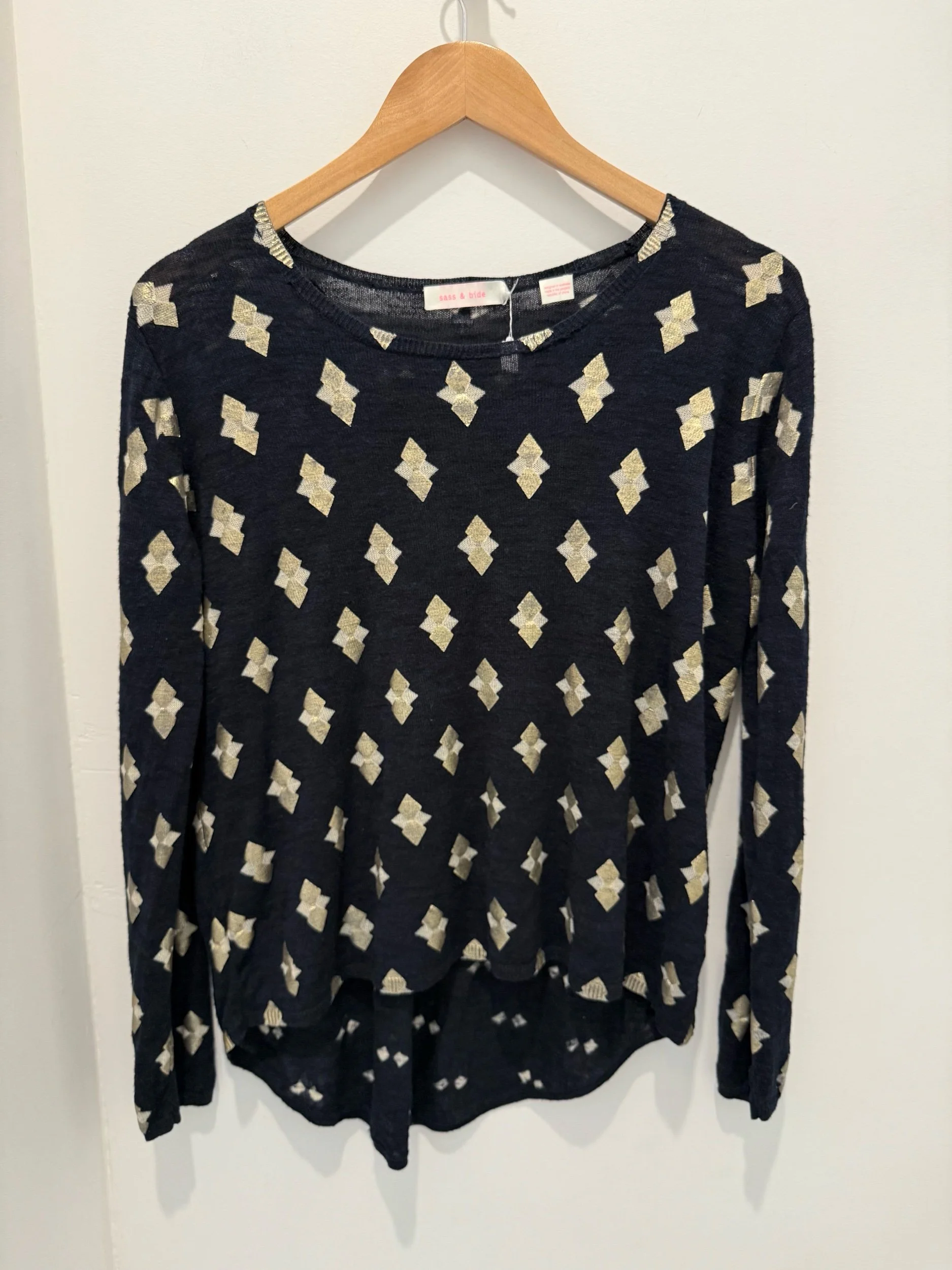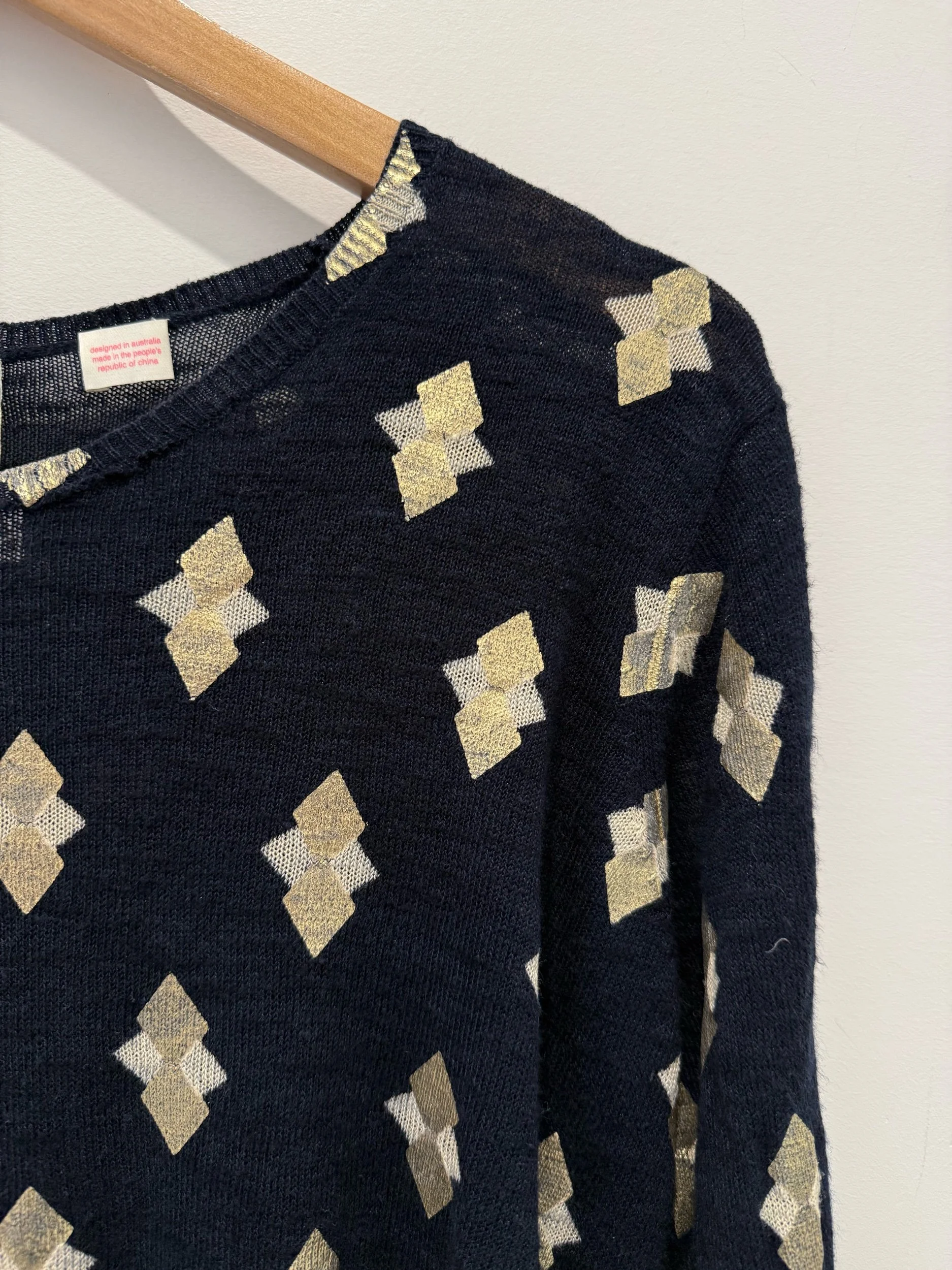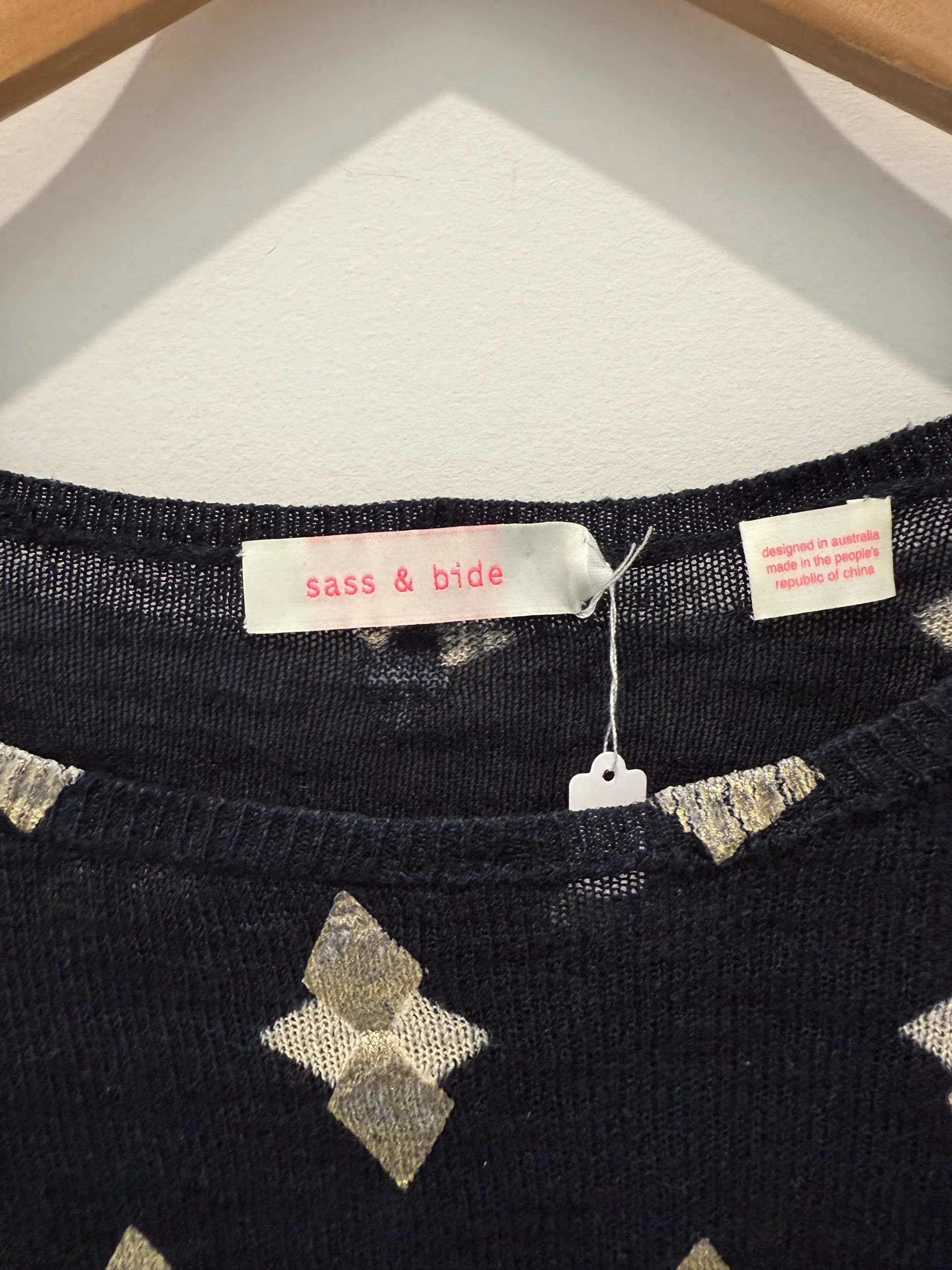 Store › Sass & Bide Freetown Knit Image 1 of 3 Image 2 of 3 Image 3 of 3 Sass & Bide Freetown Knit $59.00 Size S - will fit size 10Navy with gold printLinen & Rayon mix Add To Cart Added! Size S - will fit size 10Navy with gold printLinen & Rayon mix